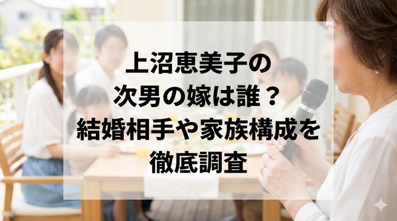 あなたは「上沼恵美子さんの次男の嫁ってどんな人?」と思ったことはありませんか?結論、次男の嫁は美人で気立てが良く、上沼さんとも良好な関係を築いている女性です。この記事を読むことで上沼恵美子さんと次男夫婦の関係性や、嫁姑問題を避けるための工夫がわかるようになりますよ。ぜひ最後まで読んでください。
